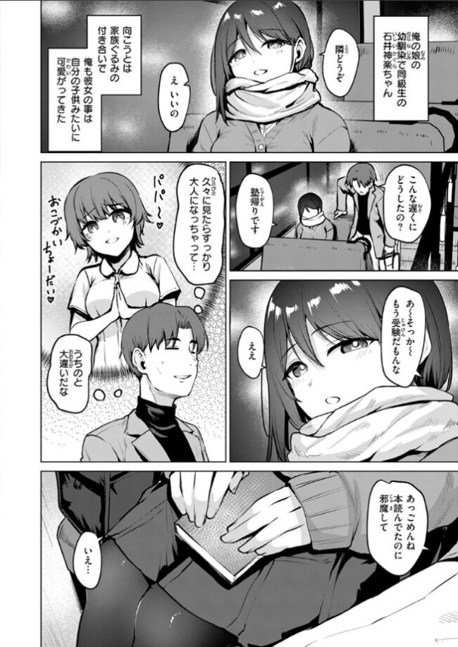 仕事終わりに乗る乗客はいつも俺だけのバス。そんなある日、娘の幼馴染の神楽(かぐら)ちゃんが窓際の席に座って本を読んでいるのを発見。受験を控えて、塾に通い始め、今はその帰りだという。神楽ちゃんに「何を読んでいたの?」と尋ねると、彼女が差し出してきたのは官能小説。「私、最近こういうことばかり興味が出てきちゃって…」といいながら彼女は、俺の股間に手を伸ばしてきた。(なんで神楽ちゃんがこんなことを…!?)バスの運転手にバレないように、騒ぎ立てて拒絶できない状況。自らのスカートをめくりながら、ズボン越しに肉棒を擦る彼女を制止することもできず……。流されるまま、俺は背徳の肉欲に溺れていく――