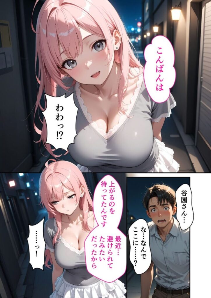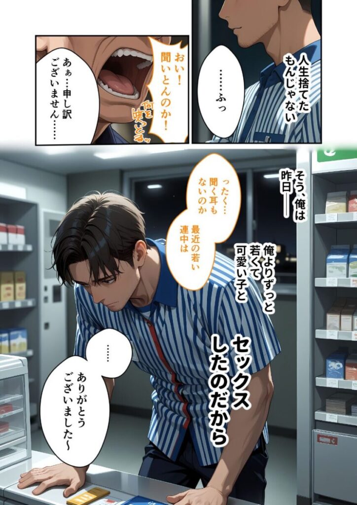 人生捨てたもんじゃないそう、俺は昨日──俺よりずっと若くて可愛い子とセックスしたのだから後悔はしてないが、谷園さんはたぶん10コは離れてるだろう俺なんかが穢してしまったという罪悪感でいっぱいだダメだ、今は顔を合わせられない、谷園さんを避けてしまう…そして、いつしか彼女は現れなくなったでも、それでいい俺なんかが手を出していい存在じゃなかったんだ「少しの間だったけど、あの子がコンビニに来てくれて幸せだったな」あぁ もっと…もっとあのおっぱいを…「もっとおっぱいを押し付けてほしい!」「やっと素直になりましたね」本編45P+AIイラスト10P収録!【注意事項】※本作品のシチュエーションは全てフィクションです。登場する人物や設定等は、すべて架空のものとなります。※この作品内に登場するキャラクターは全員20歳以上です。※本作品はAIによる生成画像を使用して制作しております。※犯罪、その他違法行為を美化または助長する意図はございません。