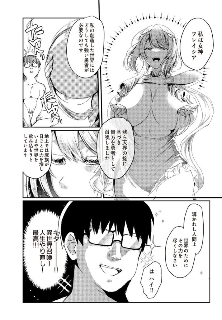 女神フレイシアに異世界に召喚され、魔王を討伐するよう依頼された主人公スキル鑑定の結果ハズレ能力だったため処分されそうになるが――追い詰められた主人公はハズレ能力といわれた‘アクメビーム(必中)’女神に撃ちアクメ漬けに!