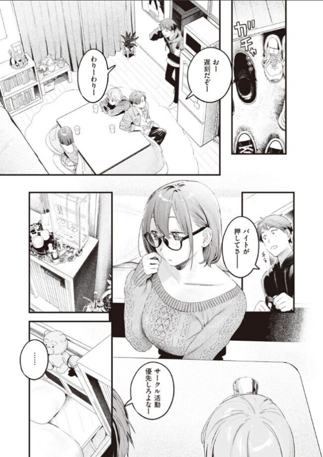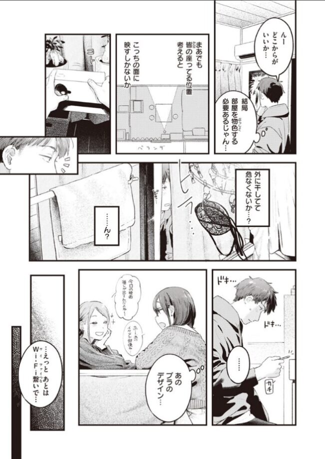 「……今日は、着けてなかったりして」サークル活動の一環として、女子の部屋に上がり込み映画鑑賞というどきどきイベントの日。道中、天空からふわり舞い降りてきたエロ下着(パンツ)を懐に忍ばせていたものの、ふとベランダの物干しを見ると同じデザインの(ブラ)が……!?まさかと思い軽くかまをかけると、そのまさかだった!!