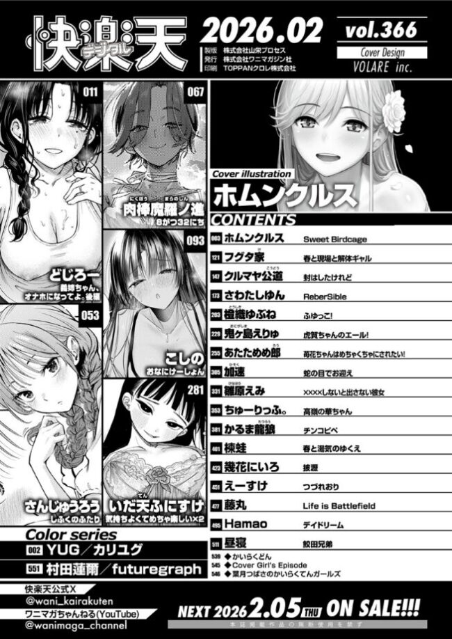 - 作家:ホムンクルス,YUG,どじろー,さんじゅうろう,かるま龍狼,藤丸,村田蓮爾,Hamao,雛原えみ,幾花にいろ,えーすけ,楝蛙,こしの,ちゅーりっふ。,昼寝,いだ天ふにすけ,加速,橙織ゆぶね,肉棒魔羅ノ進,フグタ家,さわたしゆん,鬼ヶ島えりゅ,クルマヤ公道,あたためめ郎