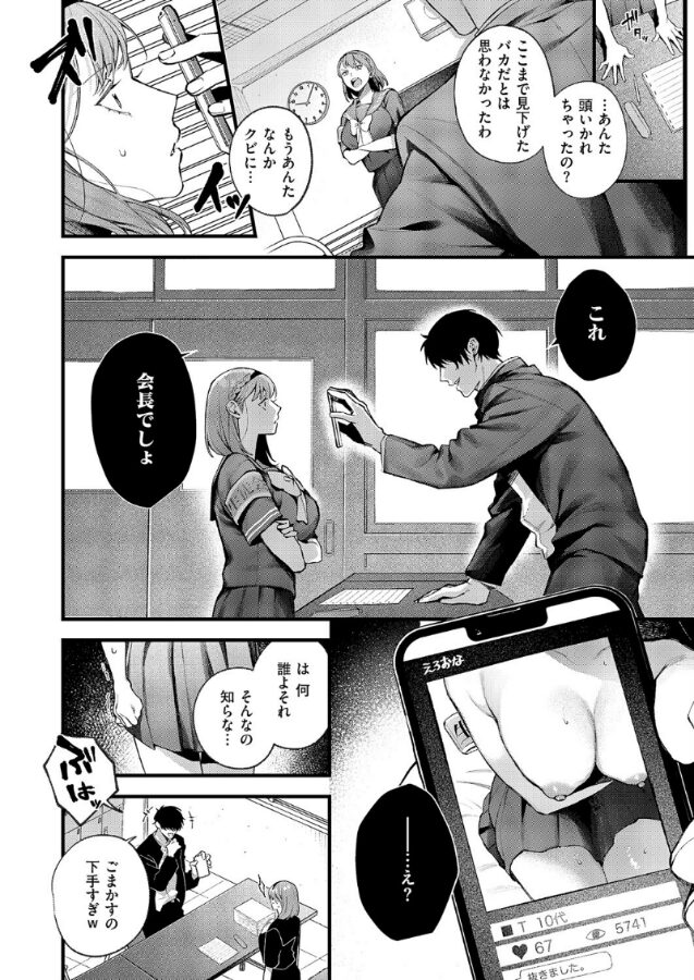 「これ、会長でしょ。ほらここ、腕章写っちゃってるし。」どうしよう…こんなのバラされたら、私ーー…周りから’鋼鉄の生徒会長’と恐れられるつよつよ女子・椿にはある秘密があった。それは校内で流行っているエロアプリにえっちな裸写真を投稿すること。ある日、椿は何かと馴れ馴れしく接してくる問題児・田中と生徒会の仕事をしていると、突然田中から卑猥なコトを要求されーー。快楽必須の次世代ルーキー・鮫ヶ島めが先生が描く、ワカラセ調教物語♪
