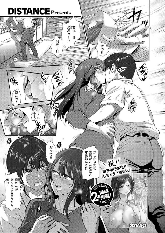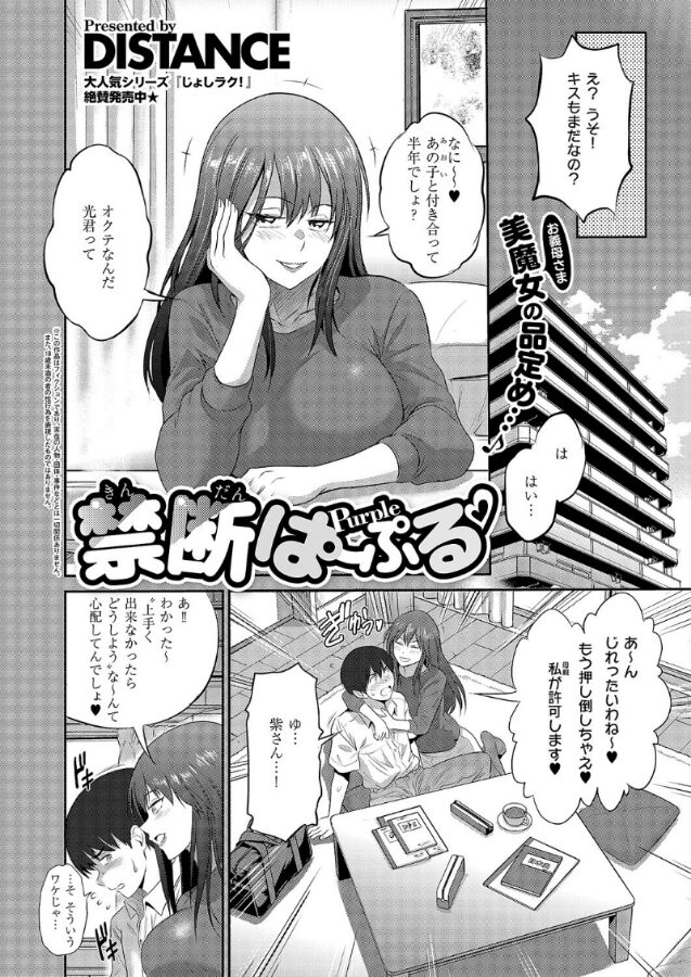「私で予行演習、しちゃう?」童貞の光を誘惑するのは彼女の葵…ではなく、その母・紫(ゆかり)だった!?その言葉を真に受けて欲望を抑えきれなくなった光は、葵の外出中に紫の芳醇な身体に飛び付かずにはいられなかった。はじめは抗う紫だったが、久しぶりに感じる雄の匂いにアソコの奥が疼いてきてしまい…♪巨(乳)匠・DISTANCE先生が描く【彼女の母】×【娘の彼氏】の禁断ラバーズ!!