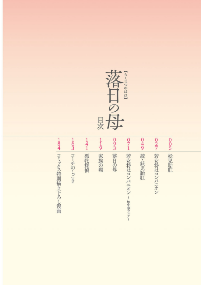 母親・女将・バニーガール他、個性豊かな爆乳ヒロインたちが織りなす濃厚エロスが凝縮された作品集が完成!! 実力派作家『バクシーシAT』が母乳描写やアナル責めなど、ハードなエロシーン満載の物語を熱筆!!! この実用度から目をそらすなッッ。 ——————————-【収録作品】 妖児胎肛 若女将はコンパニオン 続・妖児胎肛 若女将はコンパニオン〜in中華フェア〜 落日の母 家族の環 悪牝探偵 コーチのしごき 他、描きおろしページ