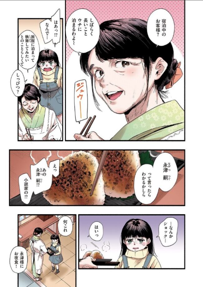 ピークを過ぎた小説家が出会ったのは、若女将と呼ぶにも〇い少女。執筆逗留中に2人の距離が、だんだんと縮まっていき……。寂れた温泉地を舞台に青い恋がはじまる。