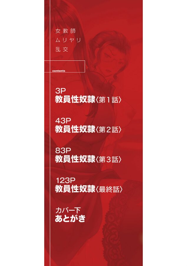 【第1話試し読み付き!!】女教師は●すのに最適だよな!女教師4人と乱パだぜ!!エロい体の女教師・紗耶先生、エロすぎるので奴●にしちゃおう!お金に困っているのにつけ込んで、1か月奴●にしちゃった◇女教師で、しかも気の強い先生と犯るのってホント、チ〇コバキバキになっちゃうよ。そんでユリカ先生も犯っちゃうように誘い込んだら、先生結婚控えてるのに処女だったんで膣内射精しちゃったよ。もっと女教師と犯っちゃおう!!【収録作品】教員性奴●〈全4話〉あとがき(カバー下)【FANZA限定特典】表紙イラストラフ案を収録!【通常特典】表紙イラスト(タイトルロゴ・トリミングなし)
