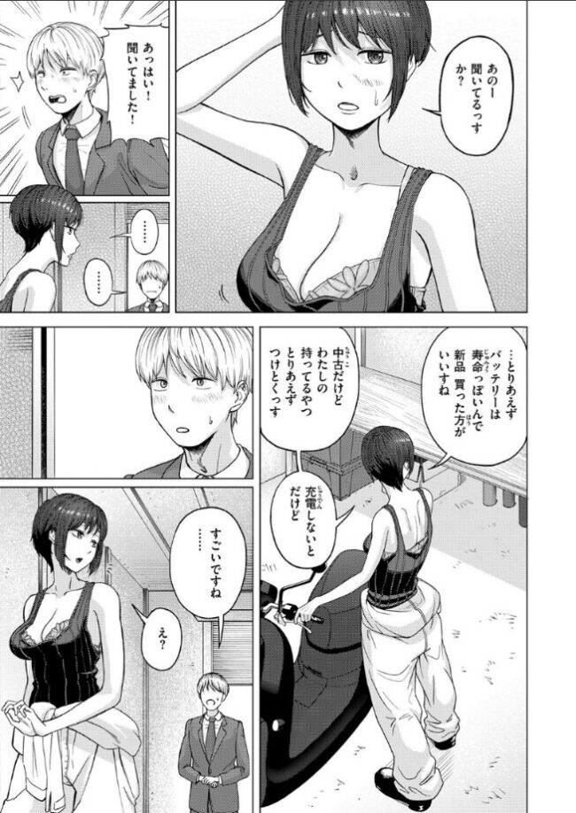 「わたし…バイク乗るとテンション上がっちゃうんすよね…」原付の調子が悪くなってしまい、大家さんの紹介で隣人のスズハさんに見てもらうことに。スズハさんは、ガチのバイクいじりを趣味にしてる大学院生で、整備してるときの姿がめちゃくちゃエロい。ブラは見えてるしなんというか全体的に乳が出ている。カッコイイ姿に見とれていたことを正直に伝えると、2ケツでドライブにいく流れに。しかし、ぶるんぶるんの胸が目の前にあって……アクシデントで少し触れてしまったあとは、歯止めが効かなくなってしまう。もちろんバレている。バレバレ。でもわかっててもマジで揉むの止まらない。もう絶対怒られると思ってビクビクしていると――