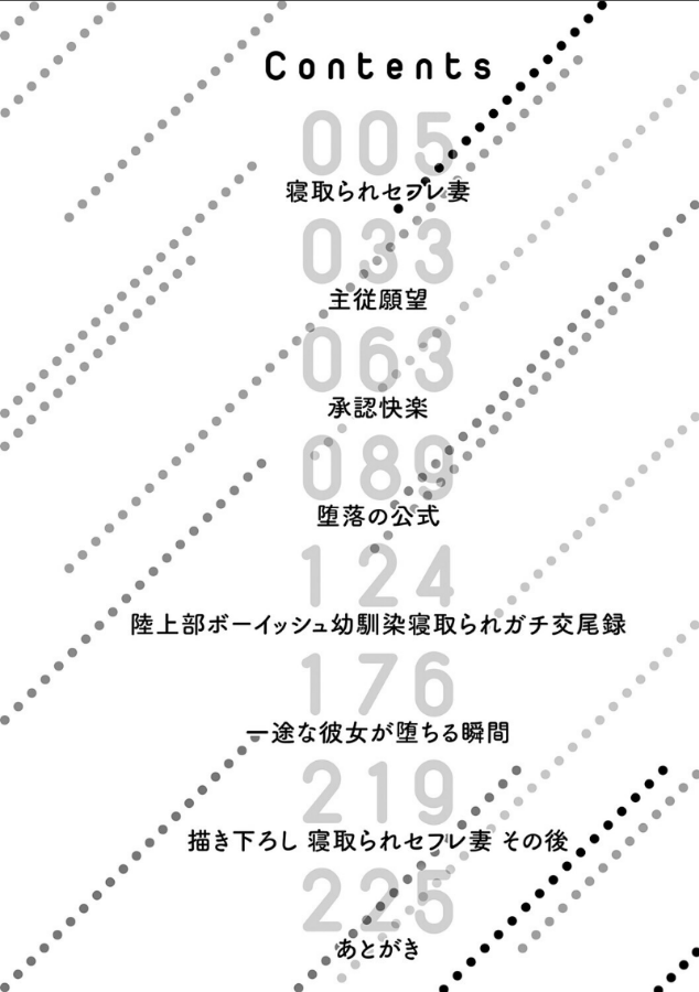 強い雄には…勝てません♪ALL快楽堕ち!「堕ち様」にこだわる新鋭が放つ初単行本!!真面目に育った優等生が!一人は寂しい配信女子が!高潔を誇る生徒会長が!貞淑であろうとする人妻が!俺を想っていたはずの幼馴染が!手慣れた男にキモチいいところを刺激され、子宮快感の渦に堕とされる!人気同人作品も収録した、抜きどころたっぷりな一冊♪【収録作品】・寝取られセフレ妻・主従願望・承認快楽・堕落の公式・陸上部ボーイッシュ幼馴染寝取られガチ交尾録・一途な彼女が堕ちる瞬間・寝取られセフレ妻 その後(描き下ろし)