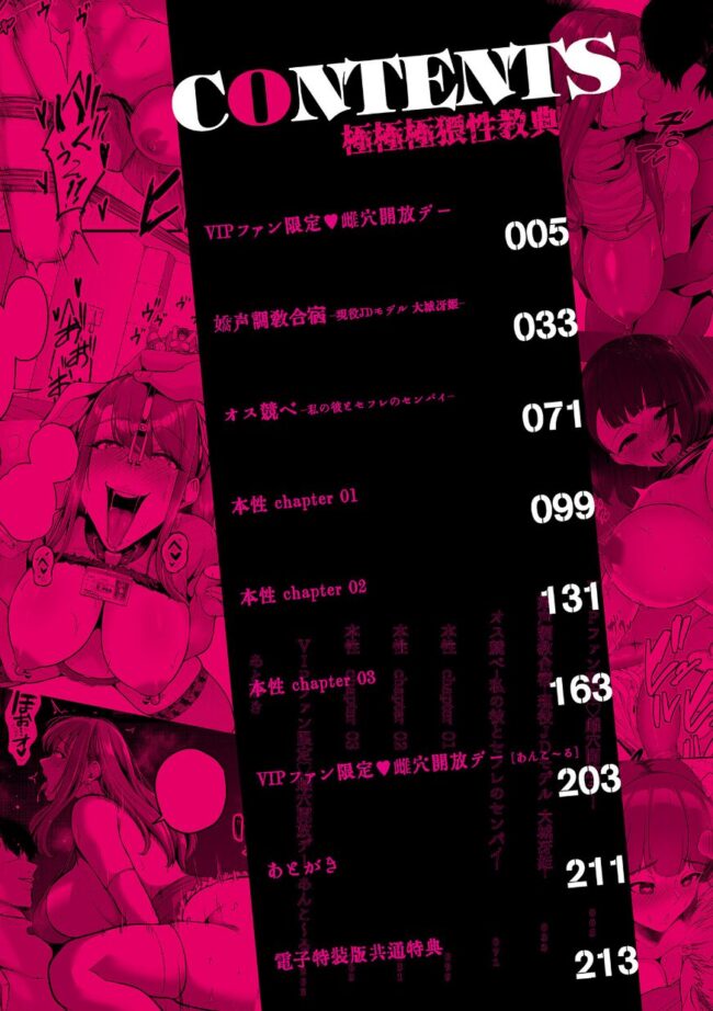 開発される、私の身体。スカウトで芸能界入りしグラビアアイドルとして人気を集めた榛名結乃。しかし気が付くと人気にかげりが出始め、落ち目を迎えていた。そんな時甘い言葉で誘われた男性アイドルとの関係がスクープされ多額の違約金支払いを命じられる。最後の手段として結乃はファンからの高額な援助と引き換えに、自分の身体を差し出すことにして……。圧倒的密度と熱量で描く、マニア必読の書!『comicクリベロンDUMA』で人気を博した、背徳的なNTR作品など短・中編6話と描き下ろし漫画を収録する著者渾身のデビューコミックス!【単行本描き下ろし8P漫画】大人気作品「VIPファン限定・雌穴開放デー」のヒロイン・榛名結乃がファンの男たちにさらなる快楽を教え込まれ――。【電子特装版 描き下ろし4P漫画】「嬌声調教合宿-現役JDモデル 大城冴姫」の雌堕ちした後日談を収録!【設定資料アーカイブ65P】プロット・キャラクターデザイン・ネームなど、作品制作の裏側を一挙大公開!電子特装版だけでしか見ることのできない設定資料を収録。【収録作品】VIPファン限定・雌穴開放デー嬌声調教合宿-現役JDモデル 大城冴姫-オス競べ-私の彼とセフレのセンパイ-本性 chapter 01本性 chapter 02本性 chapter 03VIPファン限定・雌穴開放デー あんこ〜る(単行本描き下ろし)あとがき電子版共通特典描き下ろし漫画電子版共通特典設定資料アーカイブ