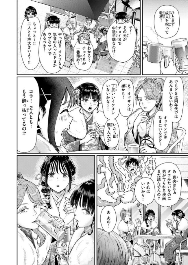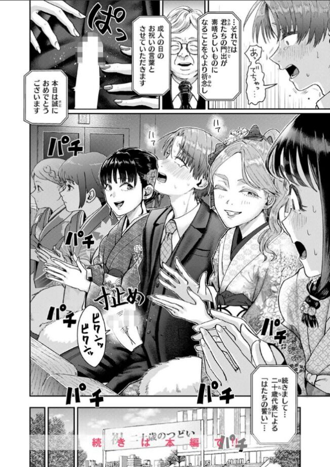 成人式のガールズトークで冴えない近況を語り合う女子3名。今日彼氏つくっちゃえば〜? なんて軽口を叩いていると見知らぬイケメンに声を掛けられる。ナンパ……ではなくて、それはかつてのクラスメイト・五十嵐(いがらし)の変貌した姿だった!!ぼっち陰キャだった過去から友達が居ないという彼。これをチャンスと目くばせして4人で一緒に行動することに。――超イケメンなのにウブで可愛い奇跡の内面を両立する五十嵐くんが、式典中にW手コキされちゃったり、式後に見せオナ(フェラ付き)させられたり、夜の同窓会のあとは…おたのしみの時間だったり……!?振袖×複数×ぐりえるもワールドで魅せる一生モン性人式メモリー。