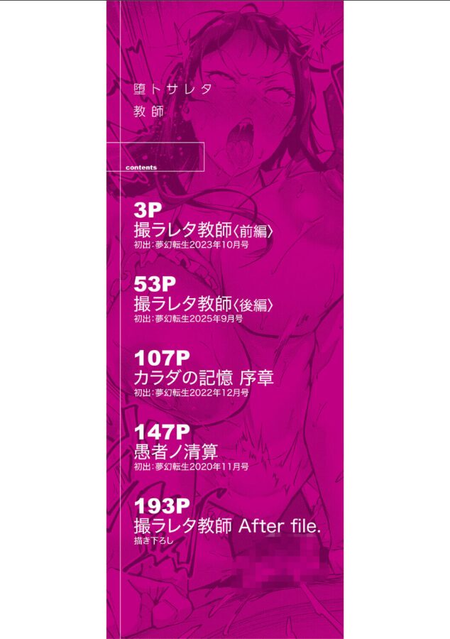 【第1話試し読み付き!!】クールぶった気の強い女教師をブチ●す!!!気の強い女教師・紗倉は、ストレスが溜まると学校でオナニーをして発散していた。しかし用務員の沼田にオナニーしているところを盗撮され、それをネタに脅され犯●れてしまう!その後も関係を強要され嫌々従う紗倉だったが、無理矢理レ●プされる事に興奮している自分に気づいてしまい…!?私はハメ撮りクズチ×ポが大好きな、クズマ×コ変態痴女です…!ダーク陵●作家・稲荷ばん茶、待望のセカンド単行本!【収録作品】撮ラレタ教師〈前後編〉カラダの記憶 序章愚者ノ清算撮ラレタ教師 After file.(描き下ろし)【特典】・メッセージペーパー・表紙原画