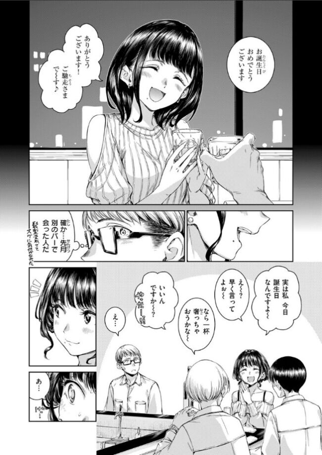 バー通いの主人公が出会った(再会した)のは先月、誕生日祝いでご馳走したことのある色っぽい美女。また会えてちょっと嬉しい……はずが……なんだか今日も誕生日とか言ってないか!?思わずツッコミを入れてしまい、退店する流れになってしまったふたり。彼女もプンスカしているが、最初は素直に再会が嬉しかったことを伝えると、なんだかちょっと距離が近くなって……。「…家来る?」「行く」慣れていない自分とは違って、どこか余裕そうな彼女と……。快楽に身を任せるワンナイト。
