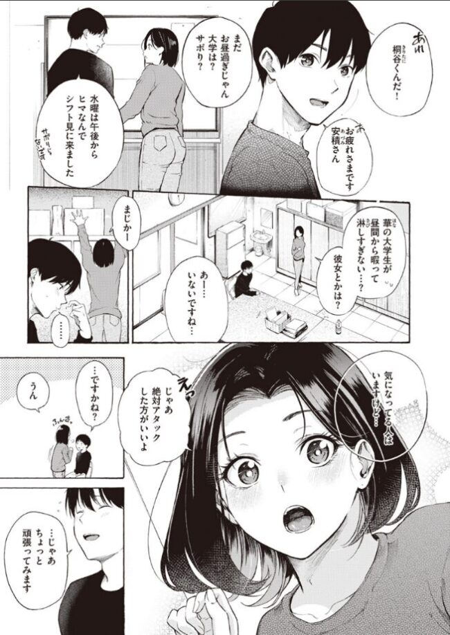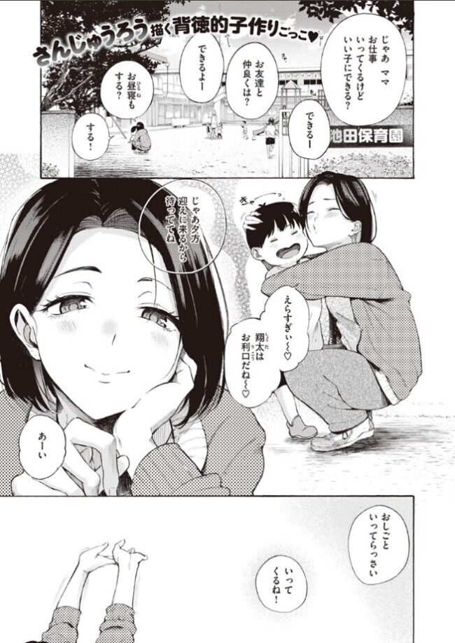 (男とふたりで買い物とか久々過ぎて――っ めっっっちゃ緊張した……!!)シングルマザーの樹里(じゅり)はある日、勤め先のバイト大学生・桐谷(きりたに)くんにアタックされてしまって……!?久しぶりの男性と二人きりの状況に発情してしまっていた樹里は、カラダを許してしまい……。子供が保育園でいない時間は交尾のチャンス♪