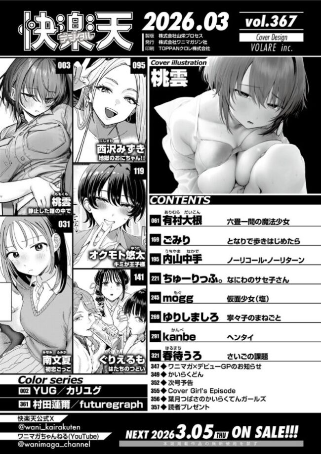- 作家:桃雲,YUG,南文夏,有村大根,村田蓮爾,mogg,オクモト悠太,kanbe,ぐりえるも,ちゅーりっふ。,西沢みずき,ゆりしましろ,春待うろ,ごみり,内山中手