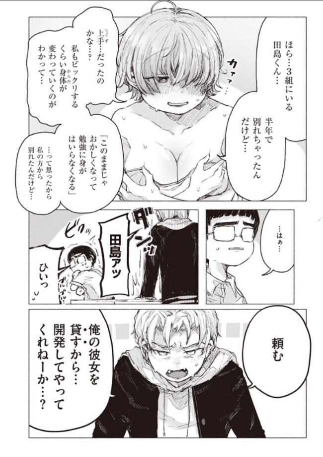 「俺の彼女を貸すから……開発してやってくれねーか……?」見た目はオタク、しかしSEXは相当なテクニシャンの田島(たじま)。田島の元カノは彼にカラダを開発され超敏感になってしまったという……。その噂を聞きつけた男子生徒・吉谷(よしたに)は付き合ってる彼女をドスケベにしたくて田島にネトラセを提案する……。