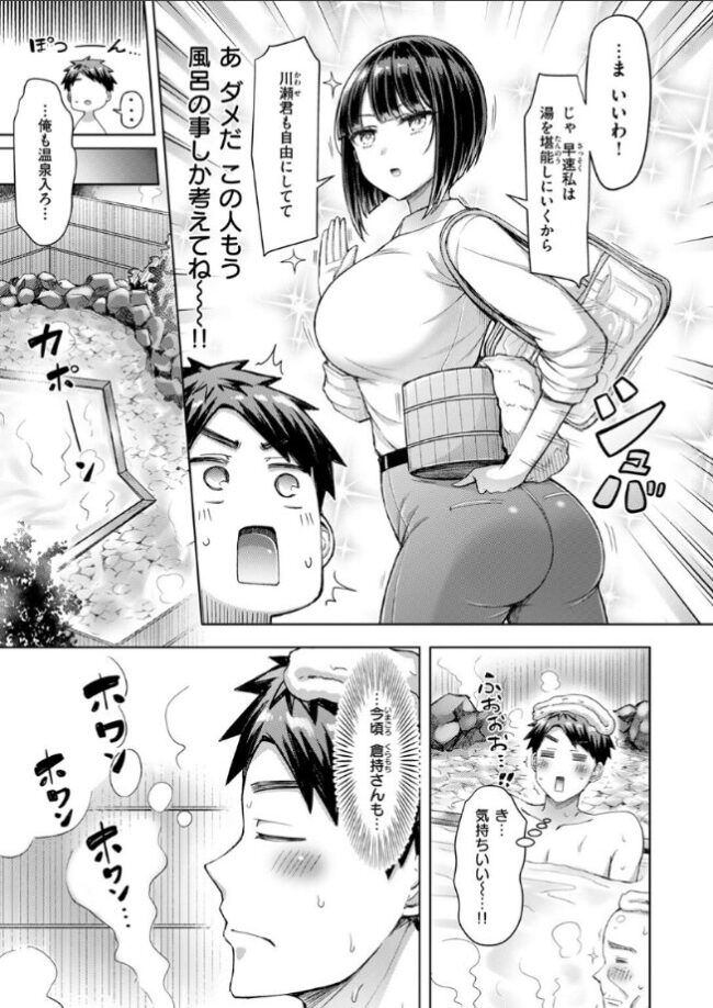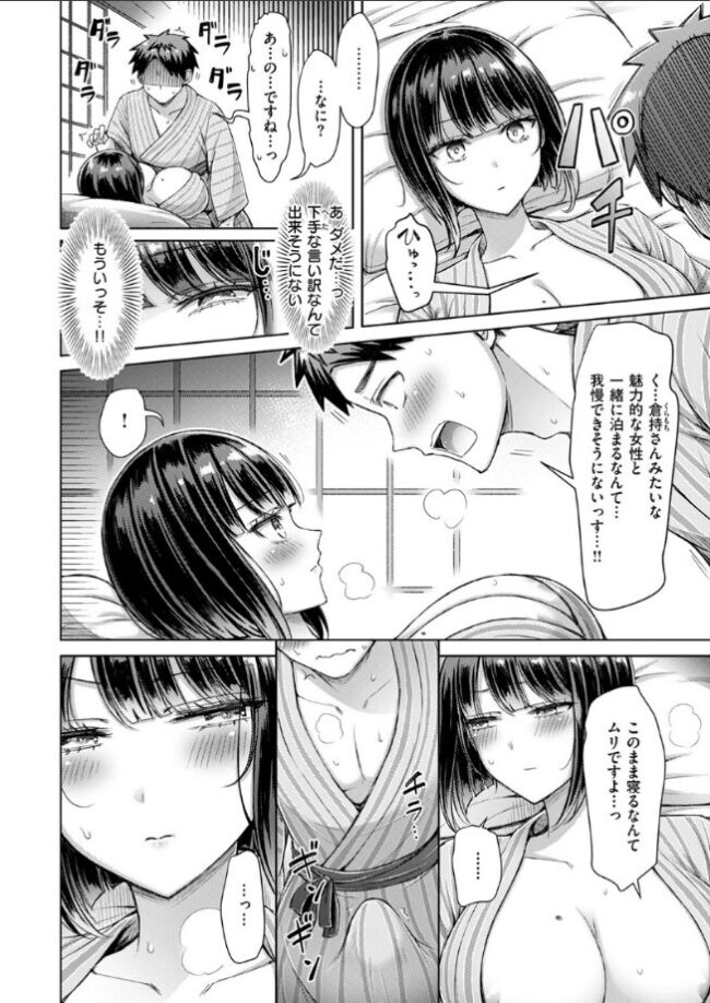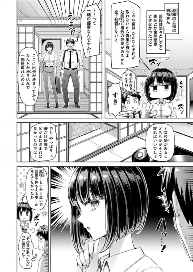 「…ちゃんとその気にさせてくれるんでしょうね?」上司の倉持(くらもち)と地方出張にきた川瀬(かわせ)。仕事を終えて宿に向かうと、そこには温泉好きの倉持が自腹で予約したという立派な温泉宿が。夕食中、川瀬が浴衣姿に悶々としている中、酔った倉持は寝てしまい……。風邪をひいたらいけないと布団に運ぶも、はだけた浴衣姿から覗く大きなおっぱいに理性は限界で……。