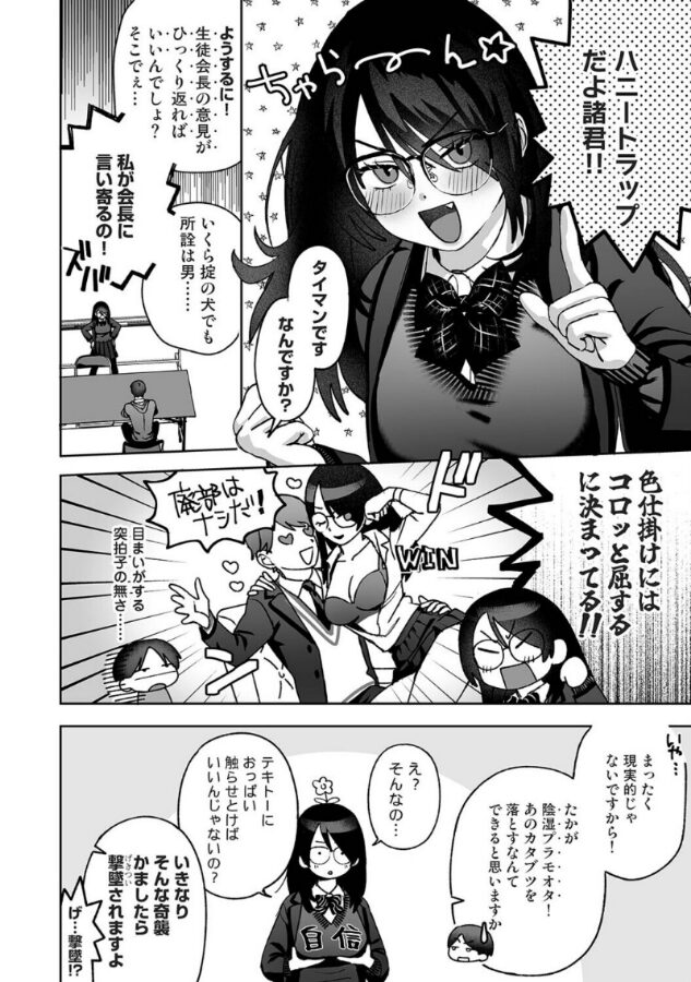 プラモ研究部の黒沼部長は廃部にされないため、生徒会長をハニトラで落そうと画策する。しかし部室の外じゃまともに話せない陰湿プラモヲタの黒沼に色仕掛けのテクニックは無いという後輩の住吉。そんな住吉に黒沼はエッチになる方法を教えてほしいと頼み込む。次の日からノーパンストッキング登校や、遠隔ローターなど住吉のレッスンが始まる…。