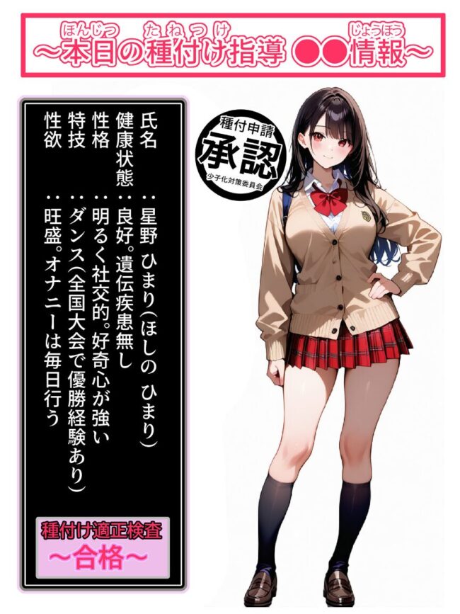 ■ストーリーある日を境に世界中から自分以外の男が忽然と消えてしまった。精子バンクのストックは残り僅か。そして貴重な「現役」子種製造機となった俺は国から重要なミッションを言い渡される。。「女子●に赴任し、種付けして●●●●を妊娠させること」たった一人で立ち向かう、世界の命運をかけた奮闘記。●●●●達に種(精子)を分け与え、妊娠させて人口増加に転じるか?■作品内容今回のターゲットは、種付け審査承認んされた「星野ひまり」彼女は緊張しながらも自らの足で種付け部屋に訪れる。。そして繰り広げられる連続中出し種付け指導?「ヌキどころ」に特化したシーン中心の作品になっています。【注意事項】※本作品に登場する人物は全て人工知能(AI)によって生成されたイラストであり、実在しません。※本作品はAI生成画像のため、手足など細かな部分が乱れている場合があります。※本作品に登場する人物は全員20歳以上です。※本作品はAIによる生成画像を使用して制作しております。※犯罪、その他違法行為を美化または助長する意図はございません。※本作品は、原作の本文・画像等を、権利者様から許諾を頂いております。(C)ラビットフット/だろす本店●●●●種付けミッション 男が消えた世界で女子●の種付け担当に励むことになった件—