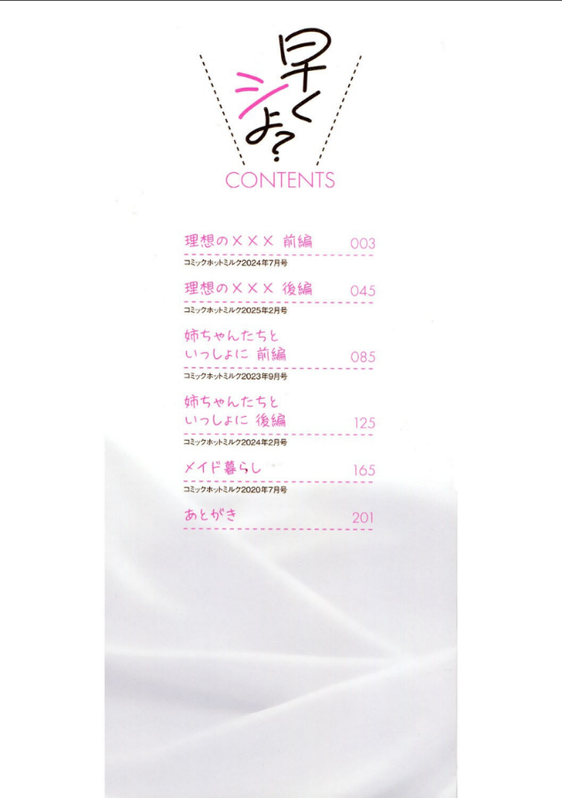 揺れる感情と、止められない衝動の先に――家族の都合で始まった二人暮らし、幼馴染みとの再会、そして理想の自分を追い求める恋――。平凡な日常から、じわじわとエスカレートする刺激的な関係へ。愛と欲望が交錯するストーリーがあなたを新たな世界へ誘う!それぞれの主人公が織りなす禁断の関係は、切なくも甘美な結末へと向かう。目をそらせない、この甘く危うい関係。■収録作品理想の××× 前後編/姉ちゃんたちといっしょに 前後編/メイド暮らし