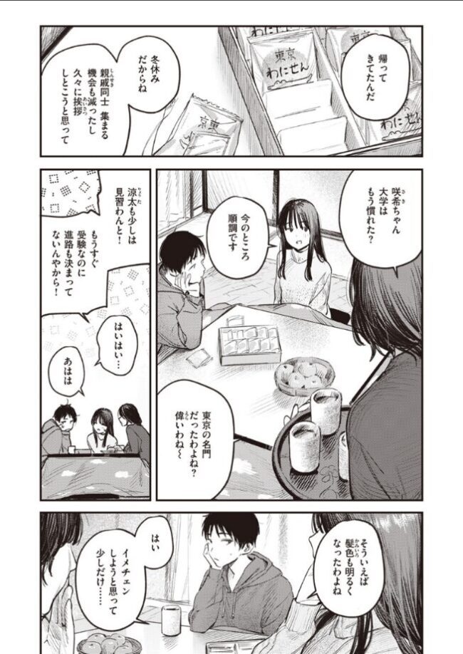 「お姉ちゃんが…面倒見てあげなきゃだよね…?」東京へ進学した幼馴染・咲希(さき)ねぇが帰省してきた。大雪で帰れなくなった彼女をしばらく泊めることになった涼太(りょうた)は、昔のように添い寝しようと布団に潜り込んできた咲希ねぇに思わず勃起してしまう。気まずい翌朝を迎えた涼太だったが、咲希ねぇの方から股間に手を伸ばしてきて……。無邪気だった思い出を塗り潰すように、爛れた日々が始まった――