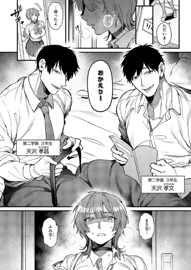 「俺たち、家族なんだからさ」学園のクール美女・天沢りくには秘密があった―。それは双子の兄達に、日常的に身体を弄ばれていること!!家族でこんな関係はおかしいと思うりくだったが、日に日に大きくなっていく快感には抗えず…♪快楽責めのカリスマ★ 鮫ヶ島めが先生が描く、双子義兄妹と巨乳美少女のド変態調教物語!