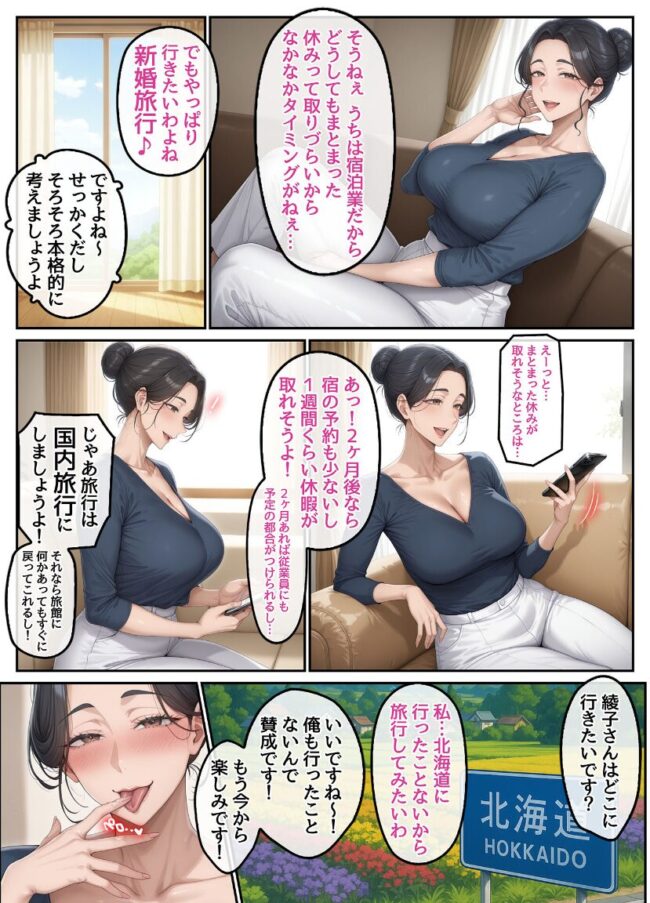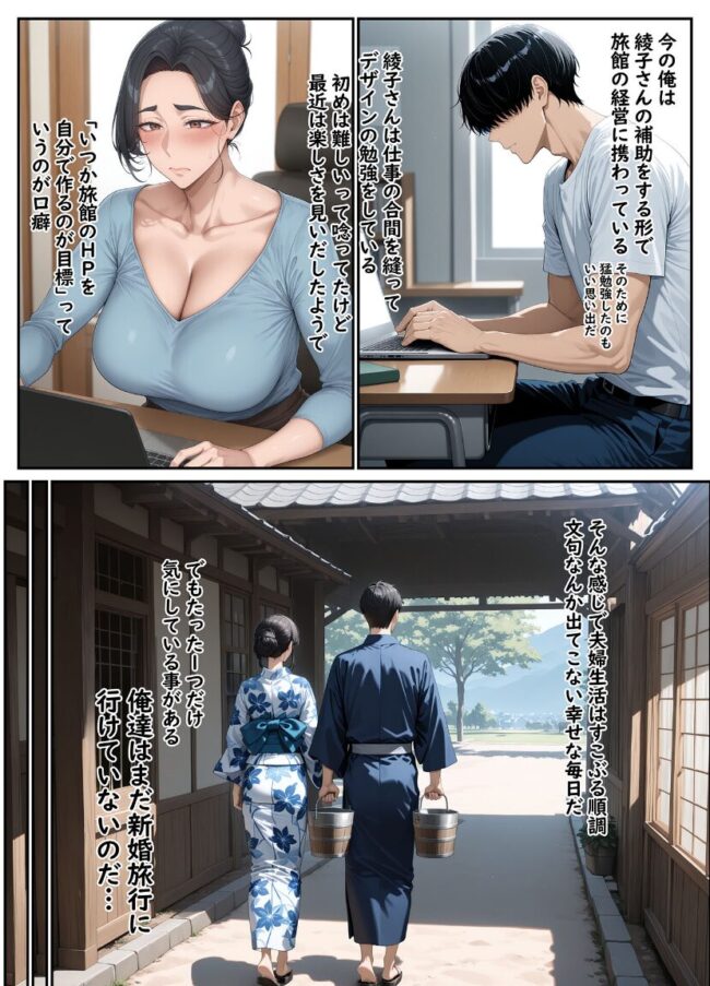 ※本作は「欲求不満を隠し続けてきた未亡人女将と汗だくで求め合う温泉宿の夜1」の続編になります。そのため、前作を読んでから購入いただいたほうがよりお楽しみいただけます。【作品内容】フルカラーのコミック形式です。本文101Pセリフあり101P+セリフなし101P = 合計202P【あらすじ】前作で未亡人の綾子と結ばれた透。旅館で一緒に働き、穏やかな新婚生活を送っていたふたりだったが、「そういえば、新婚旅行──まだ行ってなかったな」忙しい合間を縫って、行き先は北海道。ラーメン、観光、牧場、そして……ホテルでの濃密なセックス。開放感に火がついた綾子は、昼も夜も透を求め続ける。未亡人の女将が、人妻となり、そして‘母’になるまで。愛情のすべてを詰め込んだ、シリーズ完結編。【ヒロイン紹介】・水無瀬 綾子(みなせ あやこ)・身長:156cm・B106(Kカップ) / W65 / H102【注意事項】※本作品に登場する人物は全て人工知能(AI)によって生成されたイラストであり、実在しません。※本作品はAI生成画像のため、手足など細かな部分が乱れている場合があります。※本作品に登場する人物は全員20歳以上です。※犯罪、その他違法行為を美化または助長する意図はございません。※本作品は、原作の本文・画像等を、権利者様から許諾を頂いております。(C)ラビットフット/ハレノヒ欲求不満を隠し続けてきた未亡人女将と汗だくで求め合う温泉宿の夜2
