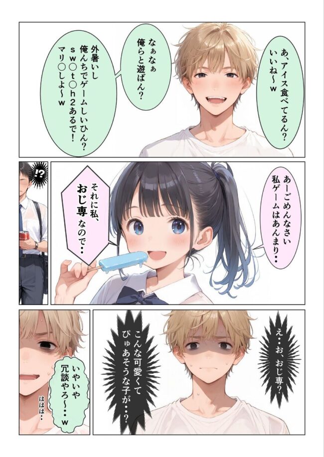 コンビニで買ったコーヒーを飲みながら一息ついていた俺。そこに、アイスを買って食べている可愛い●●がコンビニから出てきた。その●●を見てナンパし始める若者だがなんとその●●…性的対象はおじさん!おじさん大好き●●だった―――。【注意事項】※本作品に登場する人物は全て人工知能(AI)によって生成されたイラストであり、実在しません。※本作品はAI生成画像のため、手足など細かな部分が乱れている場合があります。※本作品に登場する人物は全員20歳以上です。※犯罪、その他違法行為を美化または助長する意図はございません。※本作品は、原作の本文・画像等を、権利者様から許諾を頂いております。(C)ラビットフット/桃瀬コンビニ前で出会った清楚ビッチなおじ専●●をお持ち帰りした中年おじさん(俺)の最高にラッキーでエッチな末路