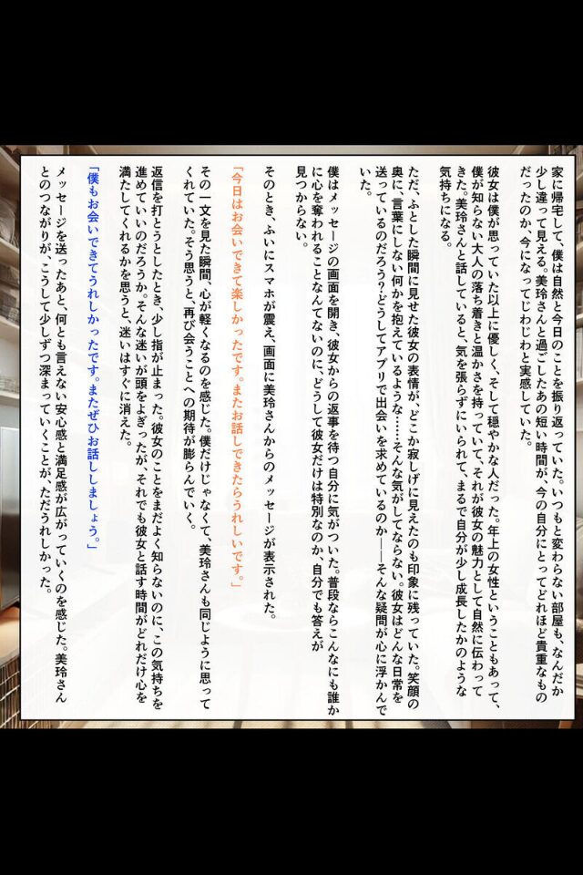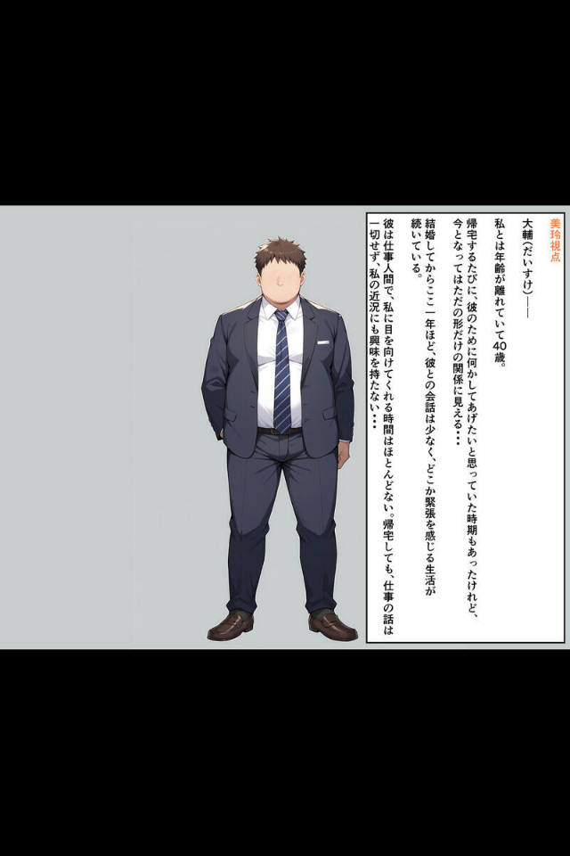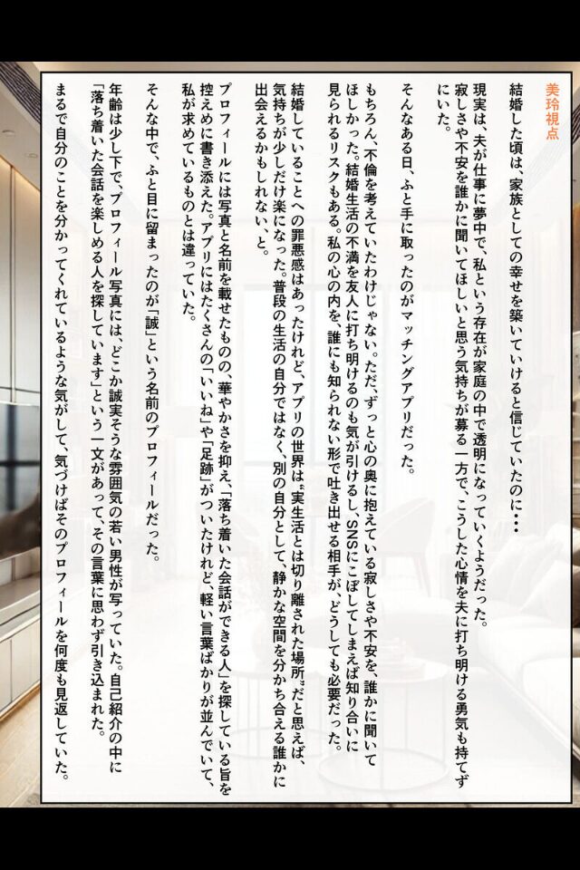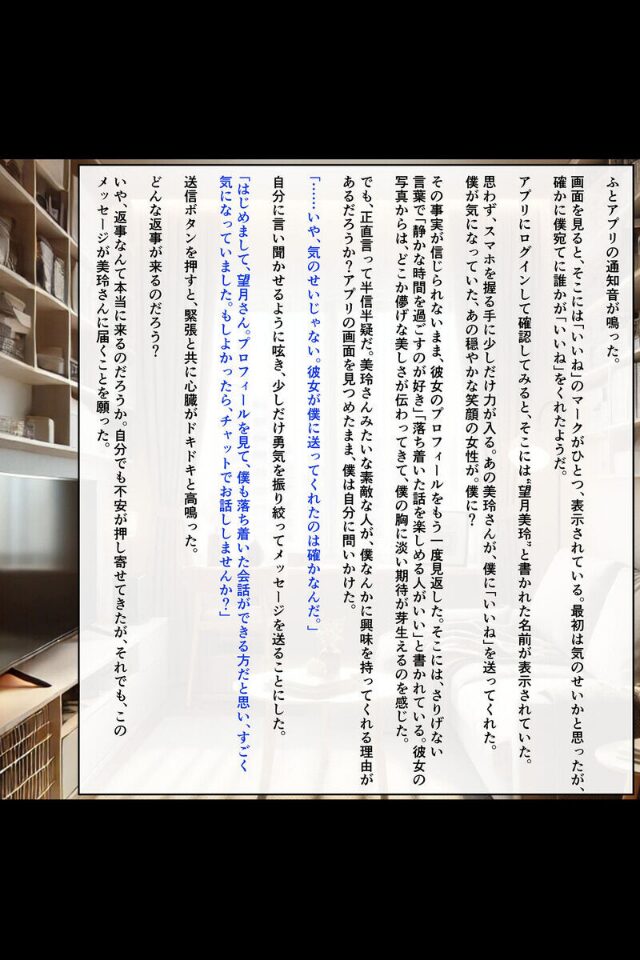 人気シリーズ4タイトルを収録!婚活を考え、話題のマッチングアプリに登録した主人公・烏丸誠(からすま まこと)。そこで出会ったのは、夫婦関係に悩む美しい人妻・望月美玲(もちづき みれい)。一見、幸せな家庭を築いているかのように見える美玲だったが、その裏には冷淡で暴力的な夫・大輔(だいすけ)との冷え切った関係があった。大輔は仕事に没頭するあまり、家庭を顧みず、さらに外では浮気も繰り返す、まさに最低の夫…美玲は孤独と欲求不満を抱え、日々を耐え忍んでいた。そんな美玲に、誠は優しさと温かさを与え、彼女の心を徐々に癒していく。罪悪感を抱えながらも、誠と共に過ごす時間は美玲にとって唯一の安らぎだった。次第に惹かれ合う2人は、やがて相思相愛の関係に発展する。果たして、誠は大輔から美玲を寝取って幸せにすることができるのだろうか…?【注意事項】※本作品に登場する人物は全て人工知能(AI)によって生成されたイラストであり、実在しません。※本作品はAI生成画像のため、手足など細かな部分が乱れている場合があります。※本作品に登場する人物は全員20歳以上です。※本作品はAIによる生成画像を使用して制作しております。※犯罪、その他違法行為を美化または助長する意図はございません。妻たちを■収録作品マッチングアプリで出会った人妻たちをクズ夫から奪い幸せにするお話1マッチングアプリで出会った人クズ夫から奪い幸せにするお話2マッチングアプリで出会った人妻たちをクズ夫から奪い幸せにするお話3マッチングアプリで出会った人妻たちをクズ夫から奪い幸せにするお話4※収録書籍をご確認の上、単巻、他合本シリーズとの重複購入にご注意ください。※本作品は、原作の本文・画像等を、権利者様から許諾を頂いております。(C)ラビットフット/ハレノヒマッチングアプリで出会った人妻たちをクズ夫から奪い幸せにするお話1