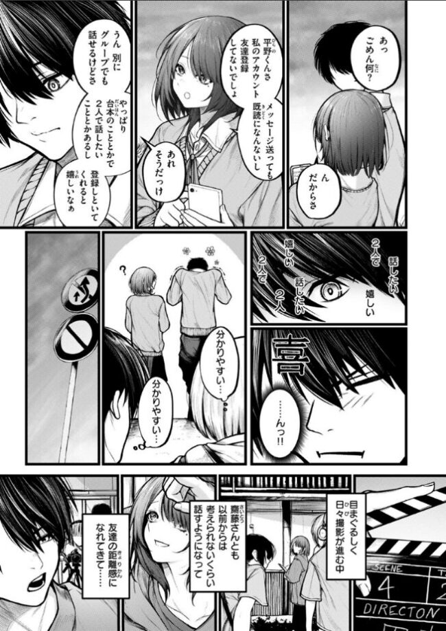 「どんどん好きになって…すっごく…えっちな目で見てる」夏。所属している映画サークルで制作中の恋愛映画で、ヒロイン・レナ役をつとめる齋藤(さいとう)さんに本当に恋している平野(ひらの)。撮影を通じて徐々に仲良くなっていき、クライマックスはキスシーン!?内心ドキドキで演技をこなしたが、どうやら齋藤さんも、思うところがあったようで……。クランクアップの飲み会でイイ雰囲気になり……そして、彼女の手が自分の股間に伸びてくるーー!?