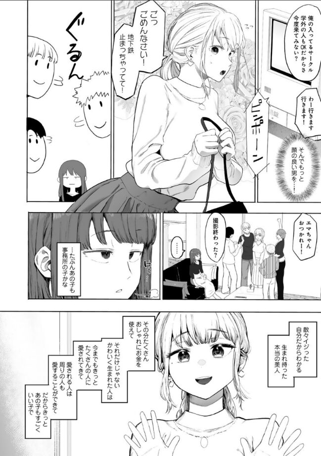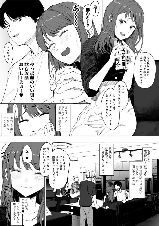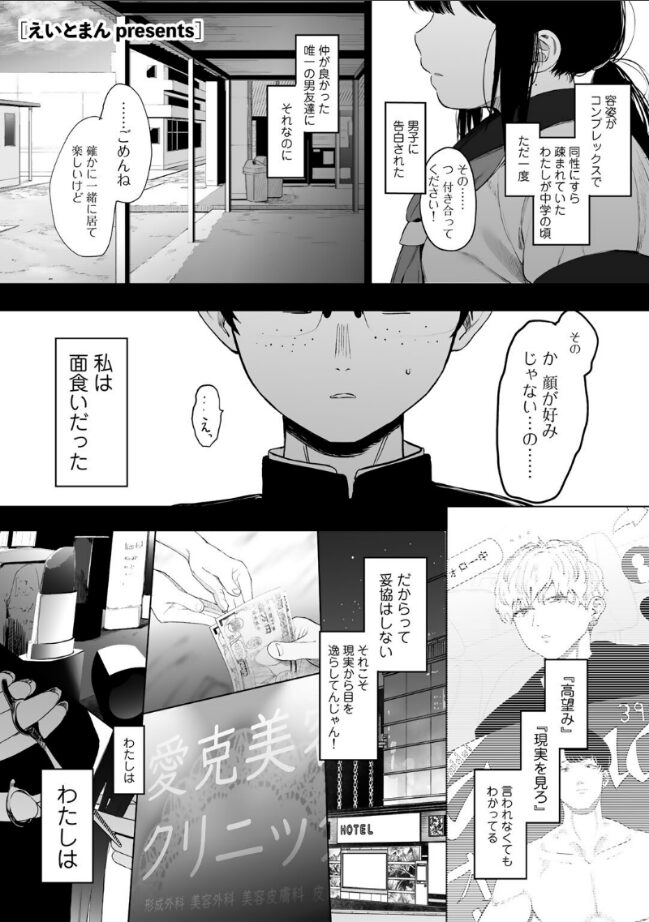 『あ〜やっぱ顔のいい男と飲むお酒おいしーよぉー』田舎から上京し、モデルの卵たちと夜な夜な遊び回る女子大生・クロミ。コンプレックスだった醜い容姿を作り変えてもなお、自分の足りないところばかりが目についてしまう。そんな彼女に話しかけてきたのは、色気漂う高身長イケメン。ビジュアル満点の彼に惹かれてお酒が進むクロミだったが、目を覚ますと裸で手錠をかけられていて…?美しく独創的な絵柄で紡ぎ出すのは――どこにでもいる、何者でもない女の子のおはなし。(COMICキスハグvol.3 掲載作品)