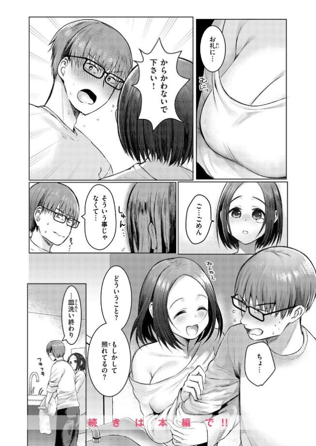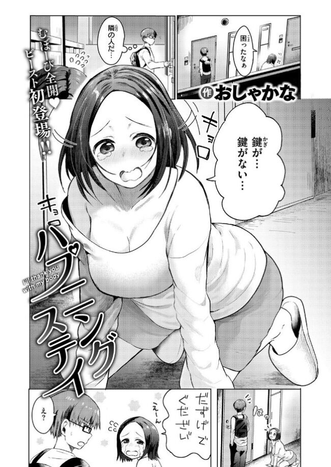 「私 家事とか何もできないけど…泊めてもらえませんか?」お隣さんがゴミ捨て中に鍵を失くしてしまったらしく、泣きつかれた俺。すぐ戻るからとスマホは家の中で、おまけにノーブラ。仕方なく、代わりに管理会社に連絡すると明日の対応になるとか……。そのまま外に放っておくわけにもいかず、家に招き入れてご飯も用意した。喜んでくれるのはいいんだけど、じーっと俺の目を見つめてきて「やっぱ何回か目が合ったことあるよね?」なんて、無防備にもほどがある。俺は男の人と一緒に部屋に入るところも見てるし、大きめの《あの声》も聞いてしまってるし。でも股間は正直で大きくなってしまう。そんな俺に目ざとく気付いて、どんどん距離を縮めてくるから、俺はもう我慢できずに……!!