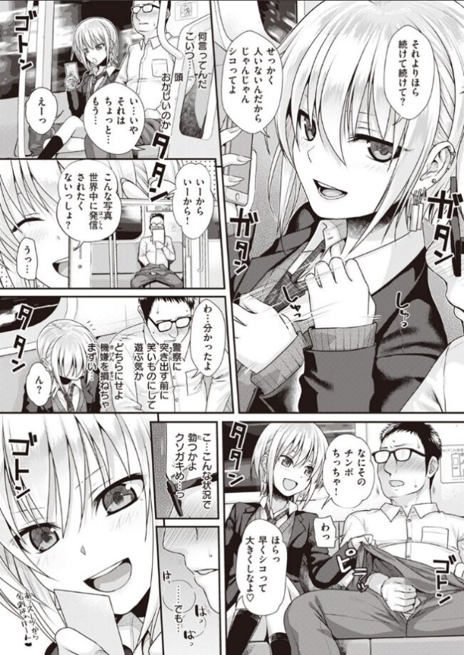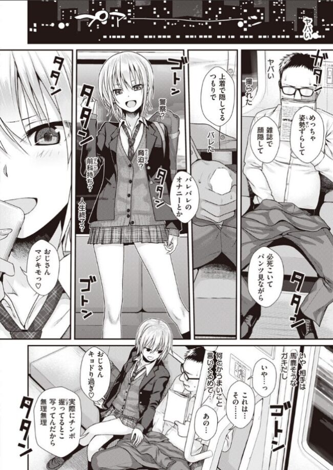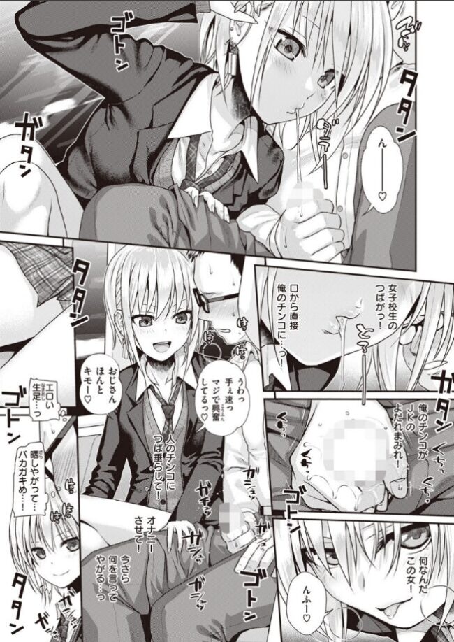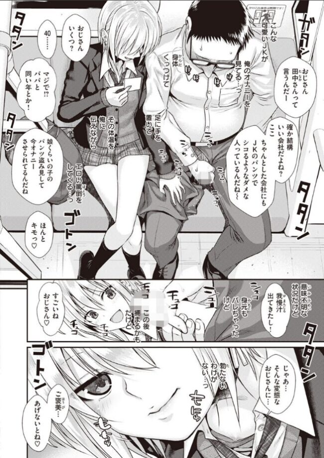ガラガラの電車内、向かいの席には居眠り中の金髪ショートのJKギャル。彼女のパンツが見えそうで……思わずスカートの中を覗いてしまったサラリーマンのおっさん。上着で股間を隠し、ここぞとばかりに生パンツで見ヌキしていたら――既に彼女は目を覚ましていて!?生意気なギャルにエロく煽られながらも、止まらない車内オナニー!! さらに、お持ち帰りもOKなJKギャルと欲望のまま背徳SEX♪