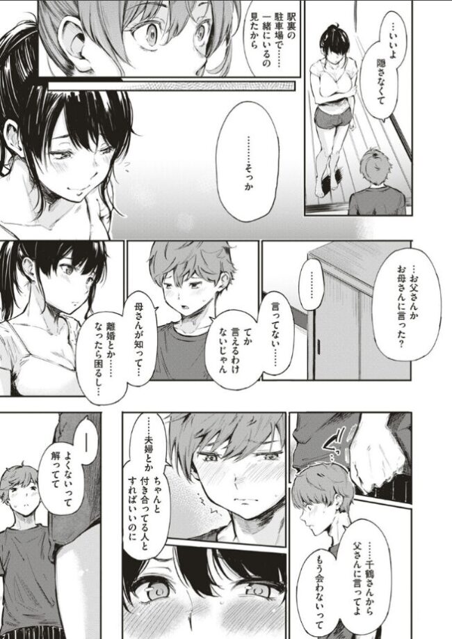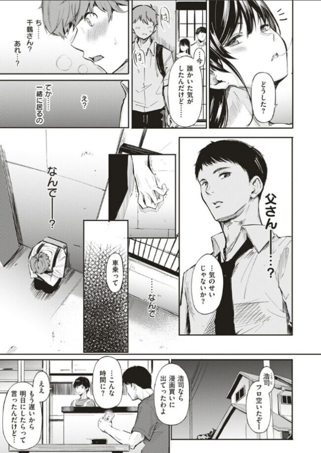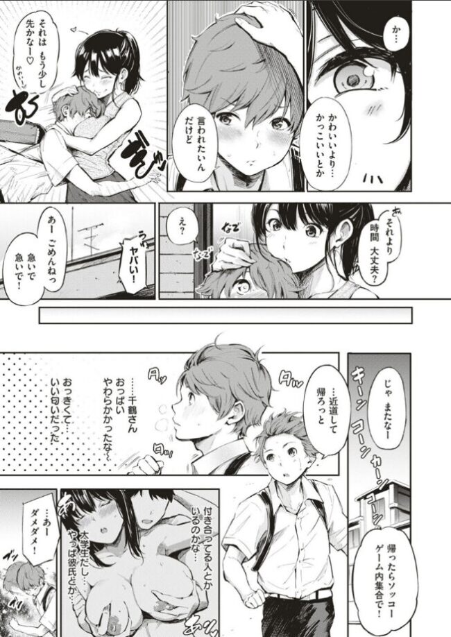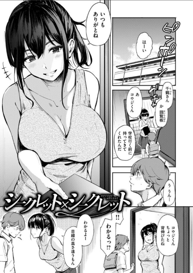 お隣りに住む女子大生のお姉さん・千鶴(ちづる)さんが気になる可愛い系男子・コウジ。彼氏とかいるのかな……と思っていたら、偶然自分の父と千鶴さんの不倫キス現場を目撃してしまう……。ふたりの関係をやめさせたいと、一人でお隣りの千鶴さんの家に向かうが――「よくないって分かってて 大人がなんでそういうことするか 教えてあげようか?」突然千鶴さんの巨乳に包まれて困惑するコウジ。でも千鶴さんの《オトナ》なテクニックと豊満なカラダには逆らえなくて♪