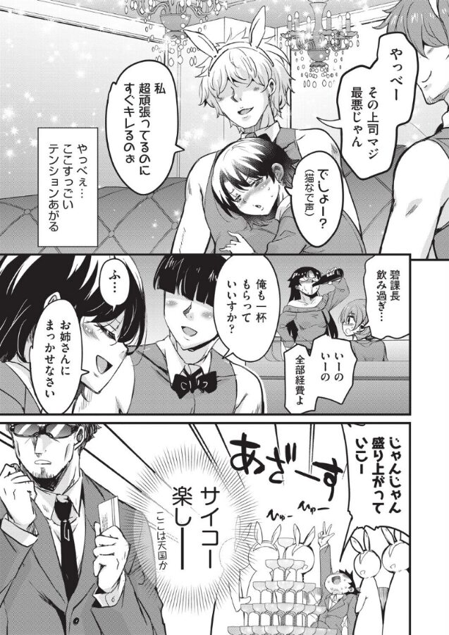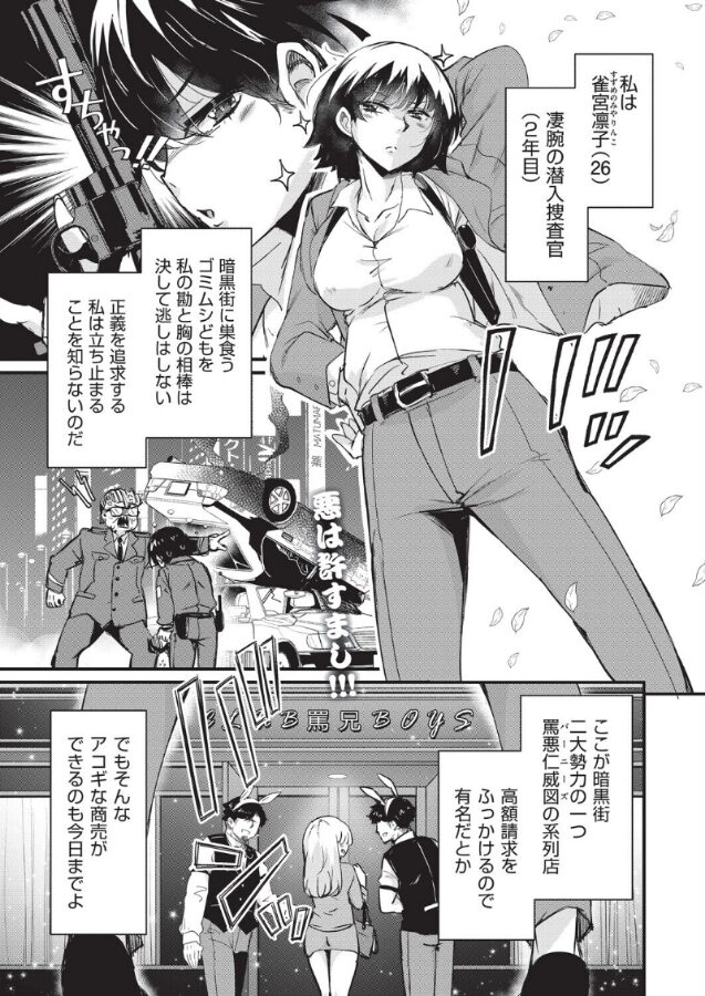 暗黒街二大勢力の一つ罵悪仁威図の系列店に高額請求をふっかける事で有名な「CLUB罵兄BOYS」へ潜入捜査のためやって来た雀宮凛子。しかし店の雰囲気に呑まれ任務も忘れ楽しんでしまう。しかも支払い用のクレカは限度額を超えていてほぼ無銭飲食・・。型どおりバレてしまい怖い男たちにお仕置きのエロ凌●を受ける!!そこへ別の席で陽依ちゃんの初給料日を祝うため盛り上がっていた陽依ちゃんの課長がやってきて…!?