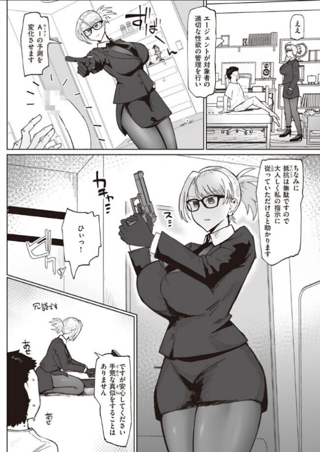 「貴方が正しい道を歩めるよう、暫くの間、私が搾精を担当させて頂きます」お気に入りのエロ漫画でシコっていると、なにもない空間から突然スーツを着たエージェント風の女が現れた!!彼女の名前は東雲(しののめ)。凶悪犯罪を防ぐための組織に所属しているらしい……。曰く、将来とんでもない犯罪者になるとAIで予測されたから、性欲を適切に管理して未来を変える……とのこと。手コキ・パイズリ・立ちバック……カラダを張った搾精がはじまる!!