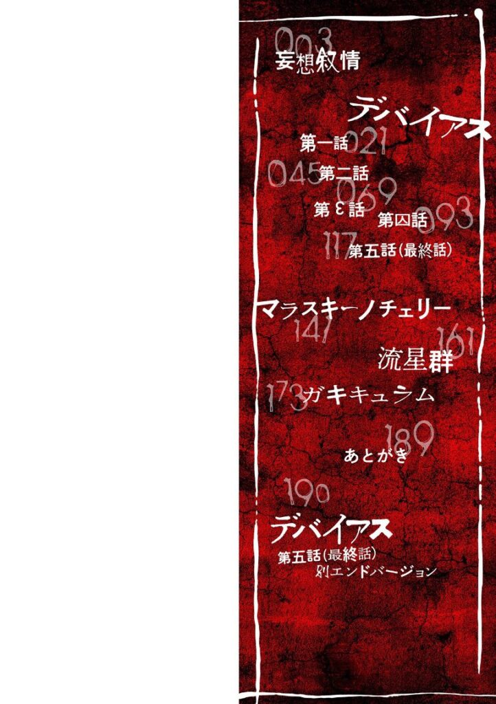 異形を追い、描く作家『心島咲』が贈る『ノスタルジー、エロチック、ホラー』の三本立て特別興行!金持ちの家に生まれ、育った大人しい少年、慎太郎。学校でも気になる少女がいるが、遠くから見つめるだけ。だが、彼が本当に欲する女性はただひとり、実の姉だ。慎太郎を学業に専念させるため、不要な性欲は母親が口で処理していた。だが彼が望むのは歳が近く、美しい姉の梅子だった。そんな時、気になる少女が刃傷事件に巻き込まれる。犯人は慎太郎の同級生の男子だが、ある『秘密教団』が背後で関わっているらしいと人々の噂が広がる。事件をきっかけに慎太郎の性欲が爆発しそうになるのを止めたのが姉の梅子だった。「じっとしてて、姉さまがしてあげるから」性欲で盛り上がったブリーフを下ろすと、誇張した慎太郎そのものを柔らかな舌で包み込んだ…。同じ頃、謎の教団では純粋な処女を使い『木乃伊となった教祖』の御前で、ある邪悪な『秘儀』が試されていた!!◆収録作品◆【妄想叙情】【デバイアス 第一話】【デバイアス 第二話】【デバイアス 第三話】【デバイアス 第四話】【デバイアス 第五話(最終話)】【マラスキーノチェリー】【流星群】【ガキキュラム】さらにデバイアス単行本化記念特別描き下ろし作品、【デバイアス 第五話(最終話) 別エンドバージョン】全10作品収録。