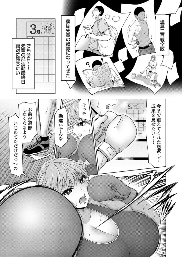 ヤリ部屋として使えなくなった腹いせに練習でボコられる新入部員。しかし、カウンターが決まると先輩とエッチさせてくれることになります。