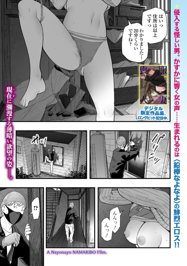 ネットで簡単ゲットの旨い仕事。ちょいっと一仕事で大金ゲット。そんな賢い俺が忍び込んだ家で目にしたのは恥ずかしい格好で天井から吊るされた下着姿の女だった! 普段は手の出ない綺麗なメガネ美人が猿ぐつわで声も出せない。人妻だって? 知ったこっちゃない。今の俺は無敵だぜ。たっぷり弄んで熱いのをナマでぶち込んでやる…!◆身動きできない人妻を嬲り尽くす!濡れた女の瞳に浮かぶ快楽に男は……?大反響作品集『喪服人妻』『寝とられて人妻』の【鉛棒なよなよ】が描く欲望の姿。※この作品は雑誌「Webコミックトウテツ Vol.112」収録作品の単話配信です。