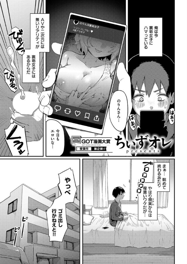 裏垢女子でシコるのが趣味の俺は、ある日 隣の人妻・みのりさんが夜な夜なお世話になっている裏垢女子「のりん」だと気づいてしまう!思わず本人にそのことを告げると、彼女から 「セフレになってください」誘われてーー!? 性欲を持て余した俺は、画面の向こう側にいた「のりん」さんのカラダをリアルで堪能しまくり♪GOT漫画大賞受賞作!! 期待のルーキーが描く、男のロマン溢れる超濃厚不倫セックス♪