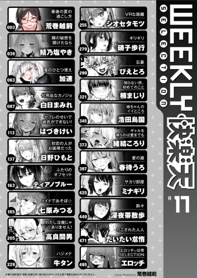 - 作家:荒巻越前,鯖乃塩やき,加速,白日まみれ,ミナギリ,エロッチ,牛タン,七原みつる,硝子歩行,緒結ころり,春待うろ,ティアノブルー,高良間男,シオセタモツ,浩田島国,楠まじり,はづきけい,深夜帯散歩,だいたい怠惰,ぴえとろ,日野ひもと