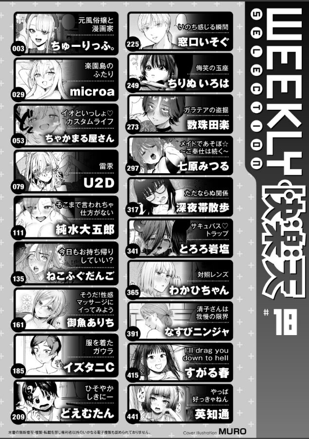• 作家:MURO,ちゅーりっふ。,microa,ちゃかまる屋さん,どえむたん,すがる春,ちりぬいろは,七原みつる,御魚ありち,U2D,純水大五郎,英知通,数珠田楽,深夜帯散歩,とろろ岩塩,窓口いそぐ,ねこふぐだんご,なすびニンジャ,わかひちゃん,イズタニC