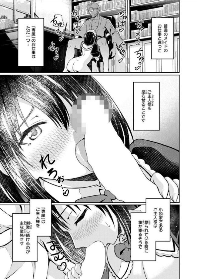 「どうぞ…『こちら』をお使いください」小説家であるご主人様が《昂っている》時に筆が乗ることから、ご主人様を昂らせるためにメイドがあてがわれる《専属》の仕事。初めて《専属》に選ばれた新人メイド・ルリの主な業務は、ご主人様を刺激し続けること。執筆が完了するまで、食事の時も散歩の時も、いつでもご主人様の性欲を受け止め続けるルリ。そして1日の最後には、執筆活動のストレスを発散して安眠していただくための一番大事な仕事、《夜伽》が始まるのだった――