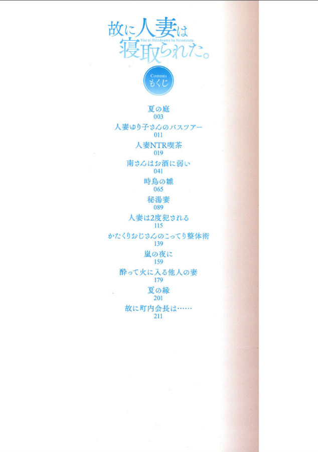 【全員、人妻です。 全員、夫以外の男とSEXします。】 夫婦で喫茶店を営んでいたのに、ご亭主が入院してしまった。今月のお家賃を待っていただけないでしょうか…と店を訪れた大家さんに頭下げる奥さんは、この商店街のマドンナだ。常連客をもてなす間も、奥さんは後ろから伸びた大家の手で尻を触りまくられる羞恥に耐えなければならない。カウンターの下に潜って肉幹をしゃぶり、必死に平静を装って客と話すときも、バックから極太のボッキを打ち込まれる。亭主が退院するまでは大家の射精処理をさせれているのだ。(人妻NTR喫茶) ちょっとした心の隙、元カレを家に上げたのが失敗の原因。すでに子供持ちの人妻なのに、迫られて抱かれてしまう。後日、お隣の肥満おじさんが訪れる。見せてきたのは浮気SEXの生々しい盗撮。人妻、美穂は言いなりになるしかない。息子に、こっちの部屋を開けちゃダメよ…と伝えて、隣人の性欲処理を務めるのだが、隣人の肉幹は驚くほど特大だった。しかも中!!で出されてしまう。(人妻は2度犯●れる)――時には流されて。時には脅されて。時には自分の意思で。間男に肉体を許した、ふしだらな妻たちの記録。NTR界の帝王・あらくれの神髄が詰まった衝撃のコア初コミックス <収録作品>夏の庭/人妻ゆり子さんのバスツアー/人妻NTR喫茶/南さんはお酒に弱い/時鳥の雛/秘湯妻/人妻は2度犯●れる/かたくりおじさんこってり整体術/嵐の夜に/酔って火に入る他人の妻/夏の縁/故に町内会長は…
