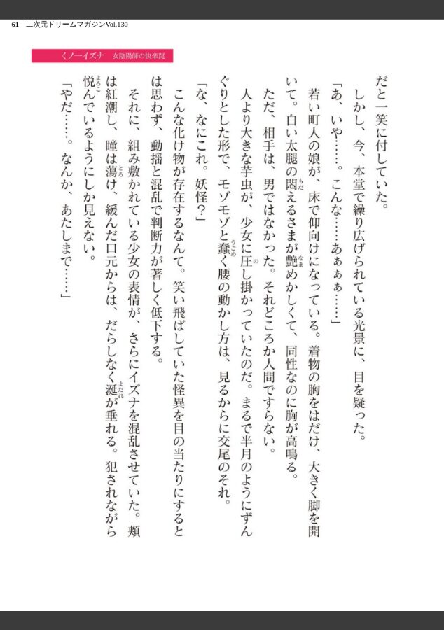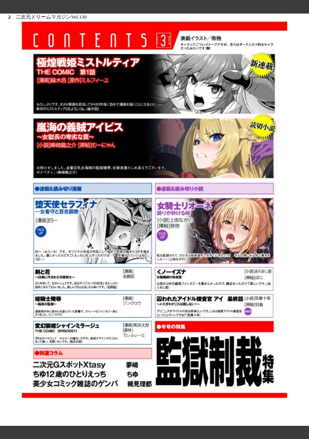 ★今号のテーマは「監獄制裁」!囚人に落ちた美少女を襲う変態尋問!!★新連載!緑木邑先生×ミルフィーユ原作『極煌戦姫ミストルティア THE COMIC』を堪能せよ!★ついに最終話…!筑摩十幸先生×羽畠先生の描く『囚われたアイドル捜査官アイ』の集大成を見逃すな!■小説■『囚われたアイドル捜査官 アイ メスガキポリスは屈しない! 最終話』 筑摩十幸×羽畠『嵐海の義賊アイビス〜女獄長の卑劣な罠〜』 峰崎龍之介×むーにゃん『くノ一イズナ 女陰陽師の快楽罠』 あらおし悠×ぽに『女騎士リオーネ 誇りが砕ける時』 上田ながの×弥弛■漫画■『極煌戦姫ミストルティア THE COMIC 第1話』 緑木邑×ミルフィーユ『変幻装姫シャインミラージュ THE COMIC EPISODE11』 高浜太郎×でぃふぃーと『剣と花 〜白濁に汚された守護剣士〜』 名飼証『堕天使セラフィナ ―女看守と百合調教―』 凹一『姫騎士陵● 〜陥落の監獄〜』 ジンクロウ■コラム夢崎/ちゆ/稀見理都■表紙弥弛