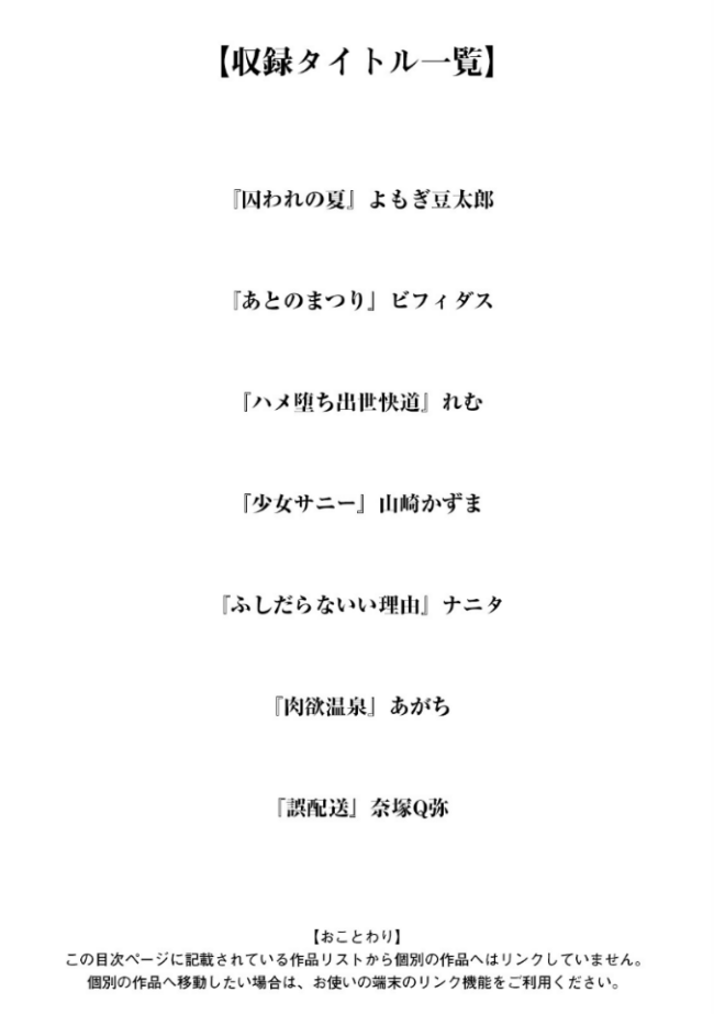 神乳SEVEN vol.69 絶対ヌける! 絶対満足! 刺激的×おっぱいwebコミック誌『神乳SEVEN』!! 今を時めく実力派人気作家たちの渾身のドエロ作品を厳選してお届け!! ’実用性’に特化した刺激的な7作品!! あなたのリビドーを熱く揺さぶる、まさに’神’な一冊!! おっぱいを欲している人は必見です。 ■追い詰められた爆乳! 「前からずっとこの乳をヤリたかったんだよ! 遂にその時が来たぜ!」自由を奪われ男の力にねじ伏せられて堕ちていく…! 今号の表紙イラストは本誌で人気上昇中・イマジン孝二が淫絶ヒロインを熱筆!! 【収録作品】 よもぎ豆太郎「囚われの夏」 ビフィダス「あとのまつり」 れむ「ハメ堕ち出世快道」 山崎かずま「少女サニー」 ナニタ「ふしだらないい理由」 あがち「肉欲温泉」 奈塚Q弥「誤配送」 ※掲載作品はエンジェルコミックスより選出した作品となります。