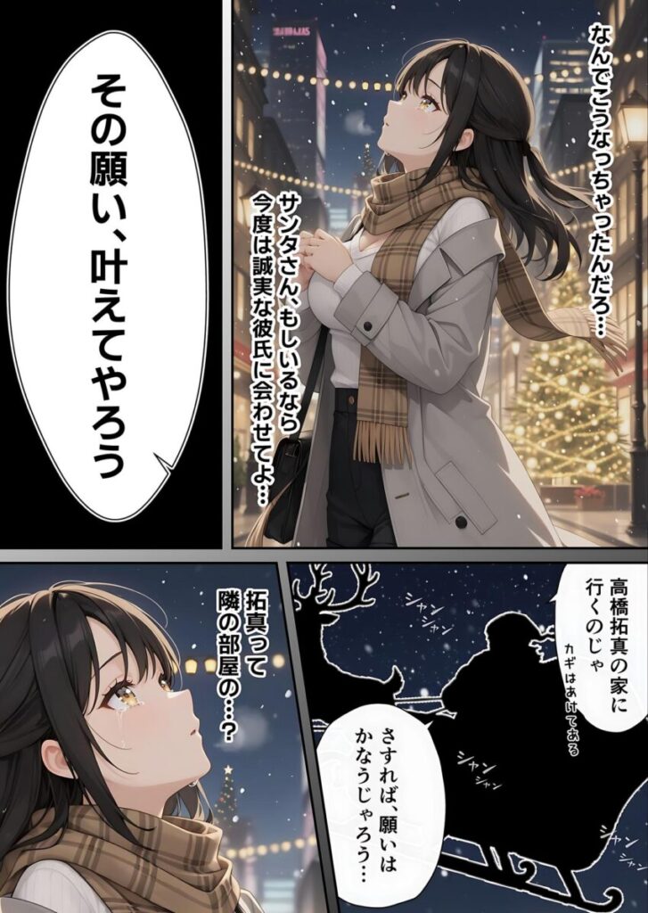 ぼっちクリスマスを嘆く童貞大学生「拓真」。そんな拓真はサンタ帽を被った猫に遭遇する。