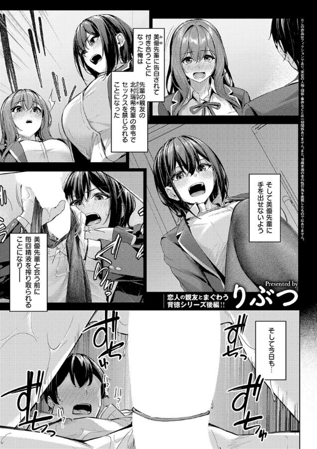 交際中の彼女・望月先輩を差し置いて、彼女の親友であるクール系美女・北村先輩に搾精される毎日を送っていた俺。しかし、あまりにも不自然な俺の様子に、望月先輩に北村先輩とのセックスがバレてしまった…!?隠れてしていたことを謝った俺と北村先輩に、望月先輩は『三人でえっちすればいいじゃん!!』と持ちかけてきて♪積極女子の超新星★ りぶつ先生が描く、親友の代わりに搾精するイビツな性春シリーズ後編!!
