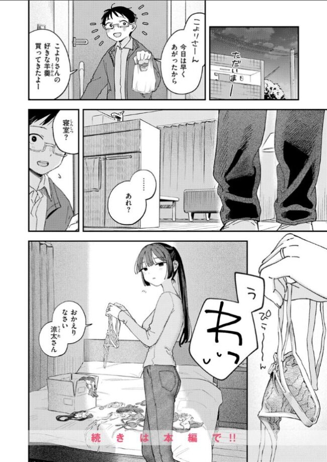 7つ下のこよりと結婚した涼太(りょうた)。こよりからの告白がきっかけだったのに、最近は触ろうとするだけでも避けられてばかり。会社の同僚には攻めの姿勢が大事だと揶揄われ、勢いでエッチな下着を勝手に買われた!?そんなこと忘れてた涼太の家には下着が届き、その上、こよりにバレてしまって……。結婚生活終わりだと思ったら、こよりの一言で事態は急転!?「それ、私…似合いますかね?」