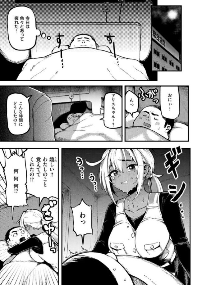 「おにぃは もうどこにも行かないで わたしの中にいて!」隣の家の少女アリスちゃんを助けてトラックに轢かれた滝沢(たきざわ)は植物状態となって眠っていたが、15年経ったある日、突然目を覚ました。病室で待っていたのはギャルになったアリスちゃん!命の恩人のおにぃが大好きで、眠っていた時も毎日来ていたアリス。あれこれと滝沢の身の回りの世話を焼いてくれる。もちろん下のお世話まで……!おにぃの部屋に残されたエロ漫画を読んで影響されたアリスちゃんは、優しくてなんでもしてくれるエロいギャルに育っていた!いつでもハメまくりの入院性活を送ってるさなか、とある工事現場で滝沢のニュースを聞いて激しく反応する女性作業員がいた。その夜、その作業員は滝沢の病室に侵入。彼女の名前もアリスだと言う。滝沢を目の前にすると発情し始めて「ずっと大好きだったおにぃ…絶対逃さない!」とケモノのように襲いかかってきた!濃い体臭にむせかえるようなドロドロの交尾が始まる……!同じアリスでも褐色・金髪の《黒アリス》……彼女の正体は?